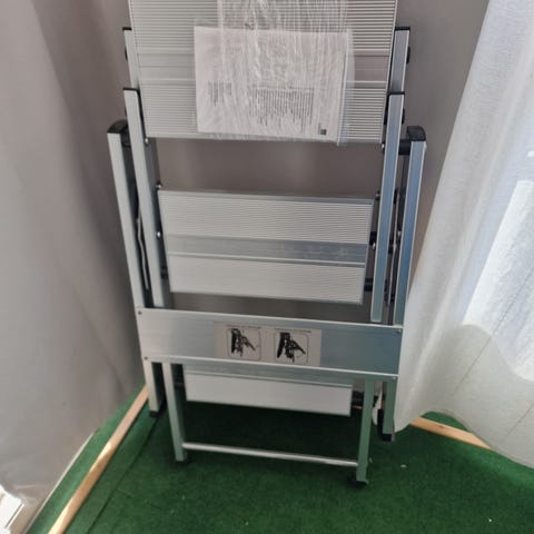 En robust och lätt professionell stege i antracitfri aluminium med stor bredd för hög stabilitet.