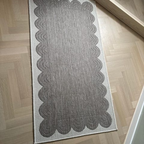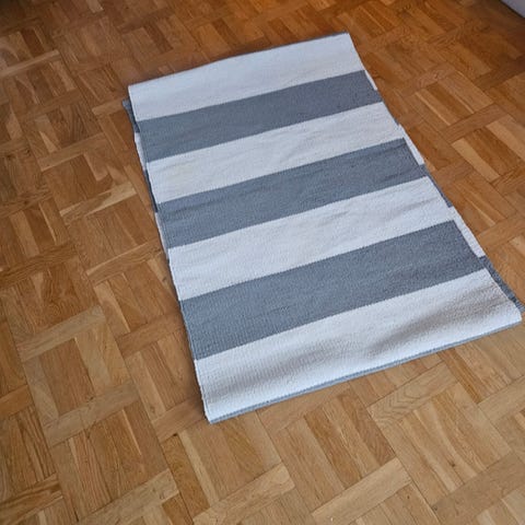 Handvävd matta, bomull, vit och grå, bredd 48,5 cm, längd 65,5 cm.