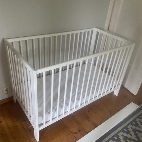 Spjälsäng med nallemotiv i trä