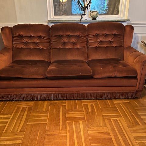 3-sits soffa märke Brunstad. Väldigt bekväm kvalitétsoffa. 2,05cm bred, 80cm djup. Ryggstöd 85cm hög, sitthöjd 45cm. Något nopprig på armstöd och rygg. Katt finns i hemmet.