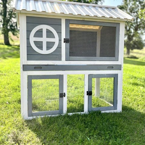 Säljer nya kaninburar. Betesbur med två våningar. Den övre delen består av ett hus med en sluten sovavdelning, och ett öppet utrymme där smådjur kan uppehålla sig. Det är lätt för kaninen att ta sig mellan våningarna via en sluttande ramp. Facken är lättåtkomlig och det finns två dörrar uppe och en dörr där nere. Buren är lätt att rengöra och taket går att öppna L134,5 x B 70,5 x H 128,6cm 2999:-