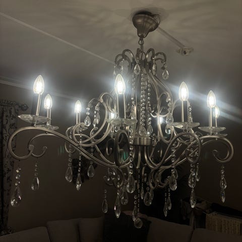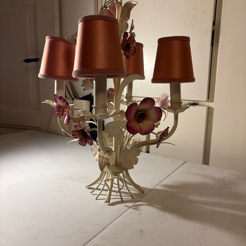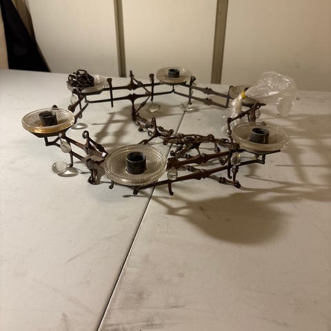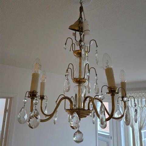 Skicket är väldigt gott. Delarna som formar ljus är nya. Lampskärmarna är original. Kronan är inköpt på 1950-talet, men kan vara äldre. Den är tung och gedigen. Måste avhämtas.