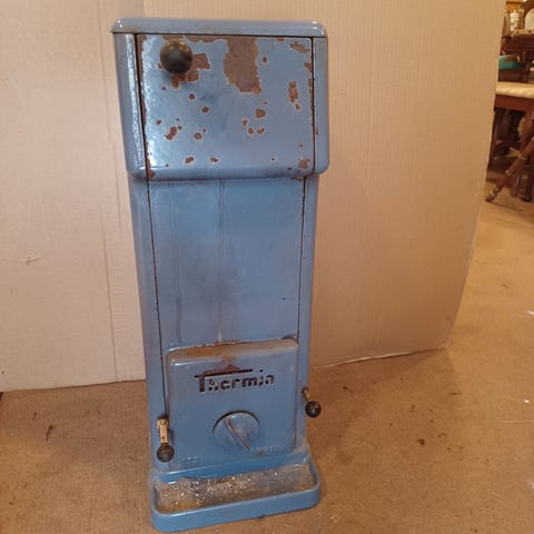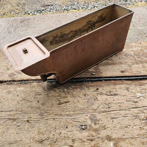Gammal vattencistern i koppar till vedspis. Cisternen är över 100år gammal men hel och tät. Fungerande mässingkran. Bägge locken i behåll vilket är ovanligt. Säljes i oputsat skick. Längd i botten 46cm. Längd upptill med vattenpåfyllningen 58cm. Bredd 12cm. Höjd 22cm. Kamin, braskamin, gjutjärnskamin, järnkamin, vedkamin, spis, järnspis, vedspis.