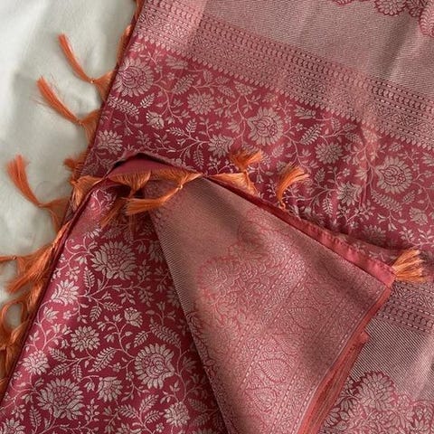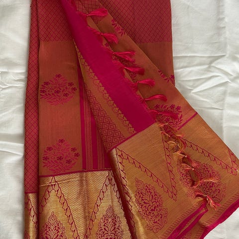 Säljer en exklusiv Kanchivaram silk saree i en elegant röd färg med guldigt mönster. Sareen är helt ny och aldrig använd.