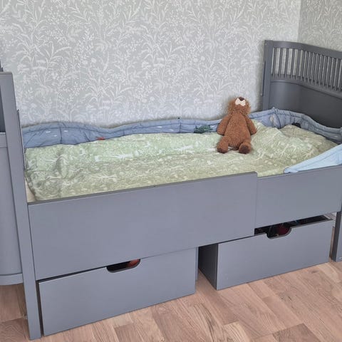 Säng från sebra att ha som spjälsäng eller junior-säng. Avtagbara sidor och möjlighet att expandera när barnet vuxit. Inklusive madrass samt tilläggsmadrass för utdragen säng samt färgburk. Äldre modell. Har kortat ner benen för att barnet lättare skulle kunna ta sig ur sängen samt slipat ner en sida för att kanten inte skulle vara lika vass när sidan var borttagen. Se bilder. Några märken från vanlig användning som går att åtgärda med färgen.
