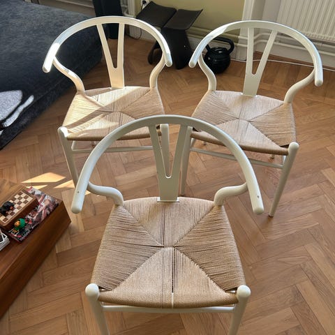 5 stolar från Svenska Hem. Stolarna är i vit metall och sitsen natur. En är lite skadad längst fram vid armstödet mot undersidan.