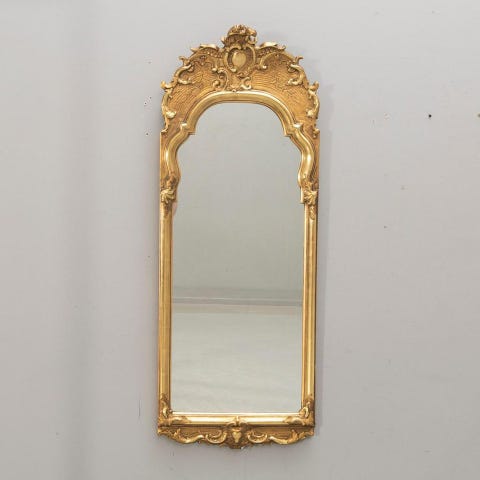 Bronserade, skuren och skulpterad dekor, spegelns mått 176x77 cm, bordets mått 79x41x79 cm