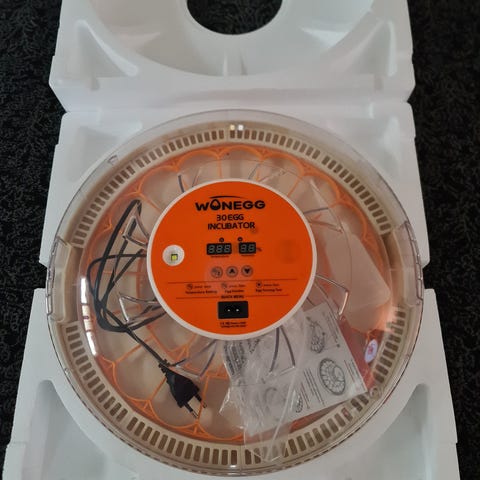 Äggkläckningsmaskin i bra skick. Enkel att använda med tydliga instruktioner och automatisk vändning av äggen samt larm vid svängningar av temperatur och fuktighet. Vändvagga tas ut innan kläckningen. Genomskinligt plasthölje gör det möjligt att observera, filma och fotografera kläckningen.