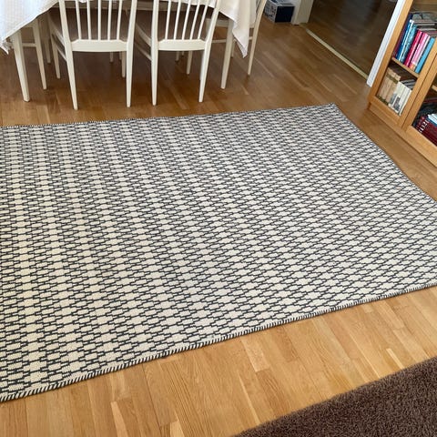 En beige matta. Måtten är 160*230. Jag köpte den för ungefär två år sedan till sovrummet, vilket betyder att den bara användes i sovrummet och inte någon annanstans. Mattan har inga skador eller revor. På grund av förvaring behöver den enkel rengöring. Mattan är väldigt tjock. Materialet är mycket bra.