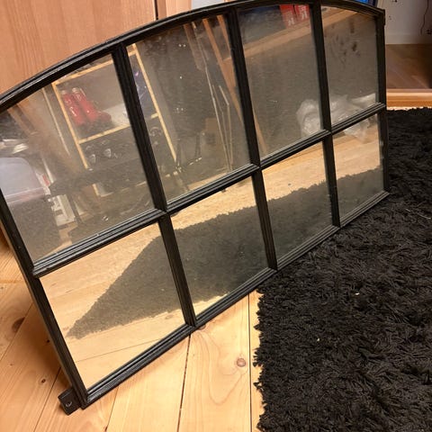 Gammalt vindsfönster i gjutjärn, med spegelglas, blästrat och målat, går att öppna, hål för upphängning, en kul inredningsdetalj.