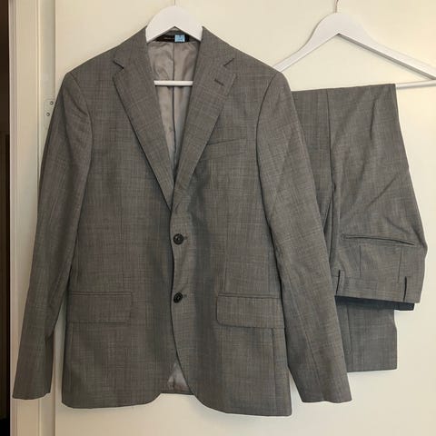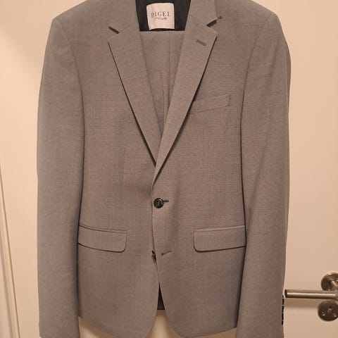 Dressmann Slim Fit kostym i grå färg för herrar, storlek 46. Kostymen består av kavaj och byxor i matchande material och färg. Passar för formella tillfällen och professionellt bruk. Se resp bild för storlek.