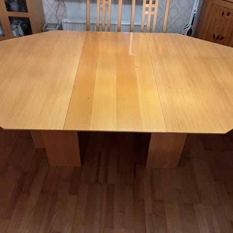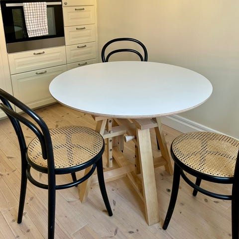 Material bord: pelare i massiv björk, klarlackad. Skiva i björkfanér.
