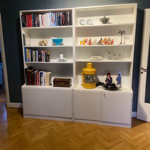 Bokskåp i bok med två lådor och ett skåp till höger. Två hyllor. Gott använt skick. 50-tal.