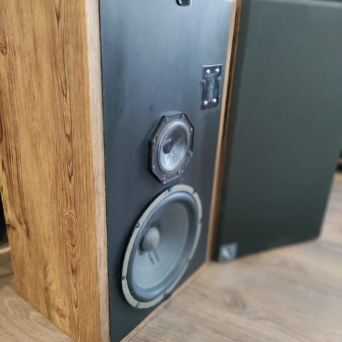 Jättefina stora högtalare som spelar fantastisk. Jazz, klassisk, techno eller metal, de klarer alle typer musik med bravur. En bindings skruv till kabeln är bytt ut med en uorginal, men av bättre kvalité. Alla element är originala och det är inget fel på de.