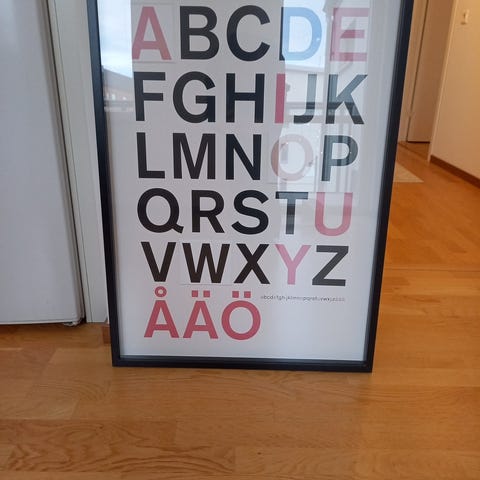 Fin tavla i alfabetet med vit ram. Storlek 53*74 cm