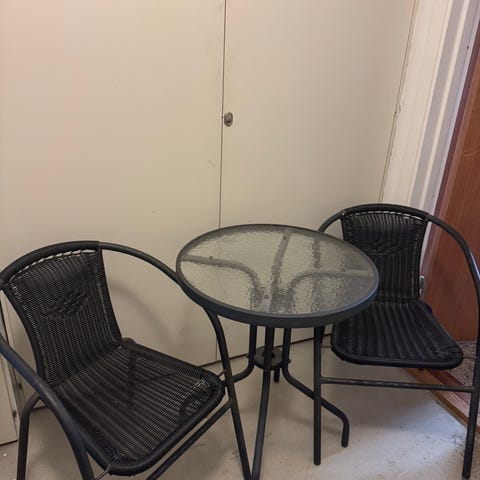 Litet bord med två medföljande stapelbara stolar.