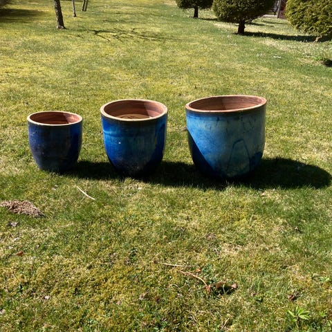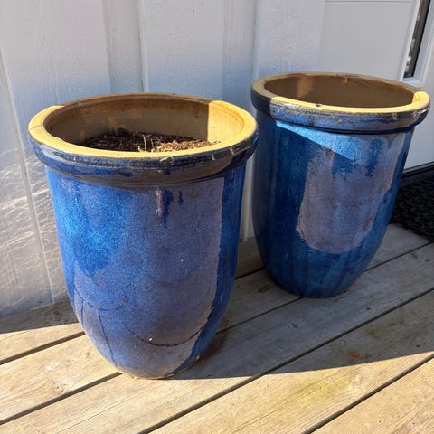 Massive keramikkrukor med glaserad yta. Frostbeständig och lämplig för utomhusbruk. Stora 35 diameter, höjd 28 Liten 27 diameter, höjd 22