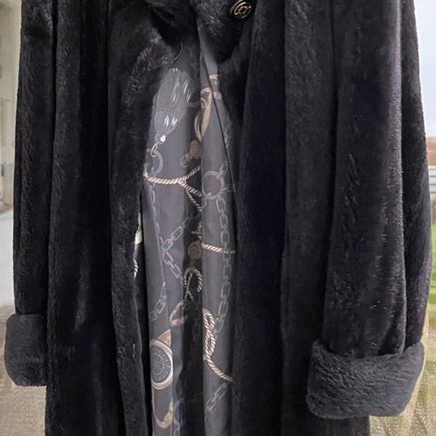 Jättefin päls som jag köpte på Väsk & Fuskpälscentrum på Drottninggatan i Stockholm 1997. Då köpte jag den för 3.750 kr, kvitto finns. Jag har använt den väldigt lite, mest har den varit i sitt fodral så den är i mycket fint skick. Kappan är av hög kvalitet och heter Martine. Den är djup svart & klockformad. Tre knäppen. Från Axel -> ned= 90 cm, bredd under armarna 70 cm och bredd längst ned 107 cm. Vikt 2 kg.