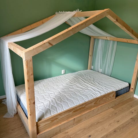 Barnsäng med husram och madrass