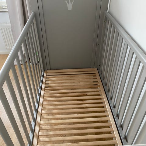 Spjälsäng och säng och madrass