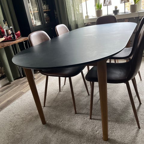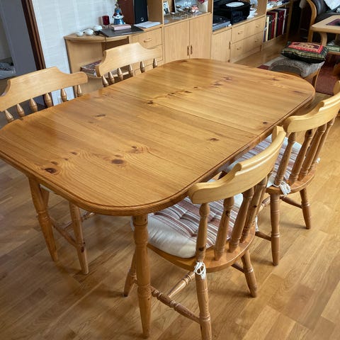 Bordsskivan behöver omvårdnad, slipas och oljas in. Mått bordet:150*90*70 cm.