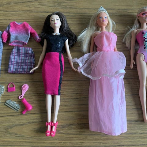 En sjöjungfru och en sjöjungfru fena men kan sätta på en Barbie, en astronaut och en Barbie mamma men två barn och vällingflaska, till barnet.