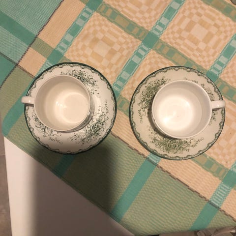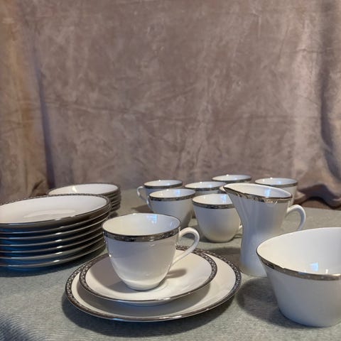 Innehåller 13 assietter, 12 fat, 9 koppar och 1 gräddkanna.