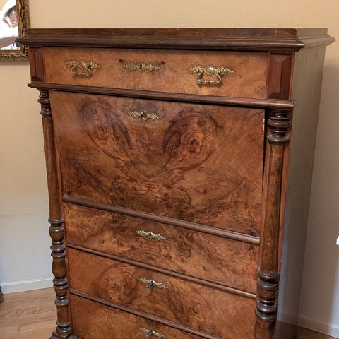 Vacker antik chiffonjé i mahogny med rikt inredda lådor.