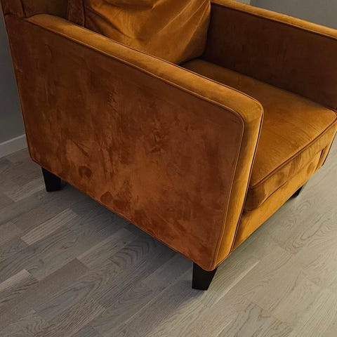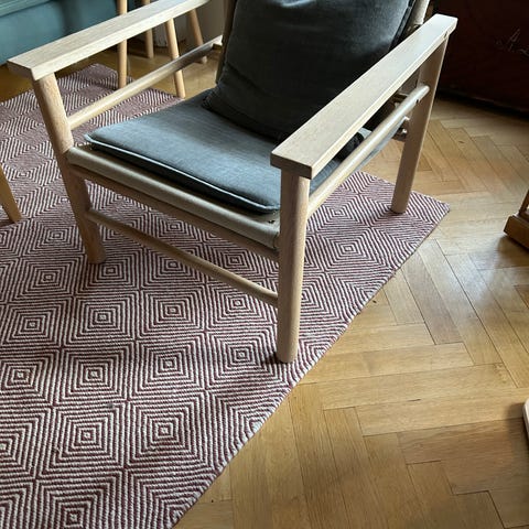 Stomme i mörk askträ, kuddar är avtagbara i materialet bouclé.
