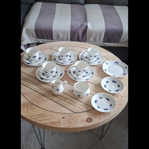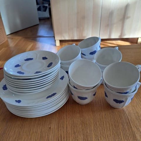 Blå Blom : 4 tekoppar med fat 11 kaffekoppar med 15 fat. 18assietter. Sockerskål och gräddkanna. Säljs vid dörr