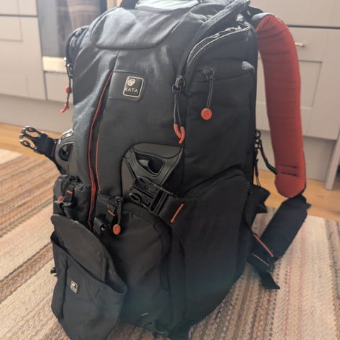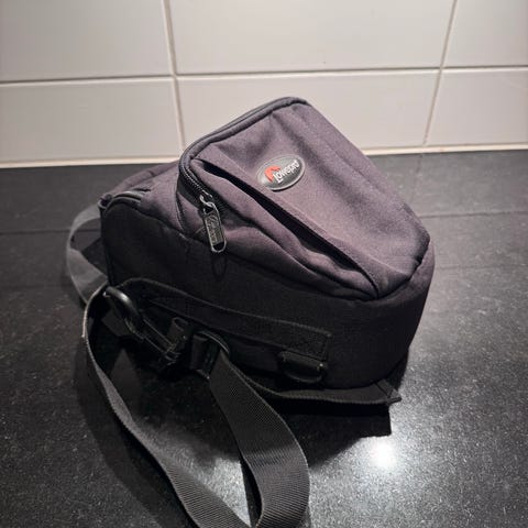 En praktiskt och liten kamerväska. Jag har packat mitt kit med ett par kamerakroppar och ett par objektiv och fortfarande haft plats över. På båda sidorna finns nätfickor för vattenflaskor eller stativ. Det finns även band fastsydda på sidorna som håller stativet på plats.