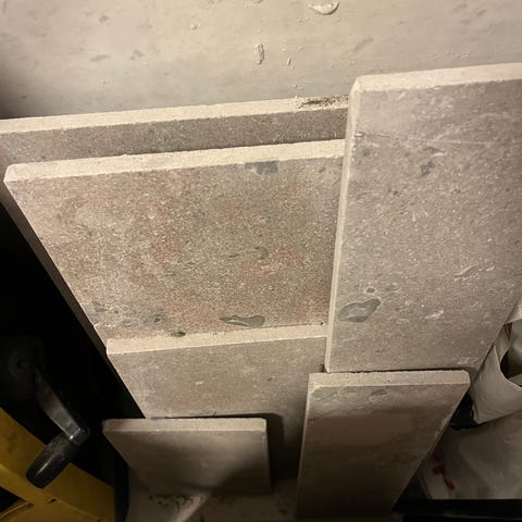 Plattor i bredd 30cm med Fallande längder. Tjocklek 1,2cm.