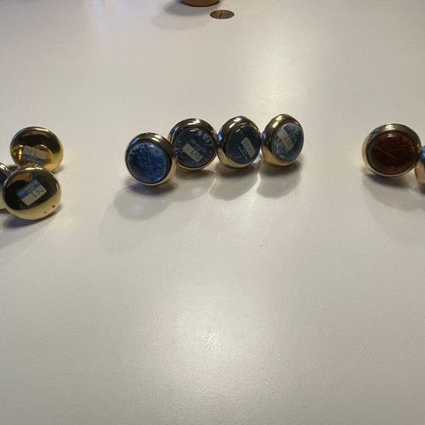 Retro Dörrknoppar i turkost glas med mässingsbricka i fint skick .
