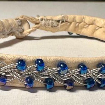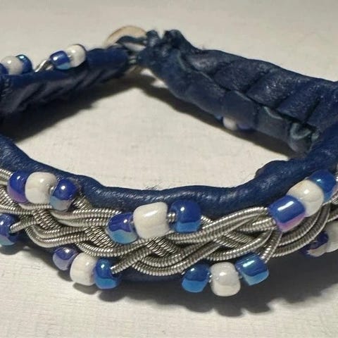 Tenntråds armband i rosa skinn med mörklila tenntråd och mörklila pärlor samt rennhorns knapp 19,5cm