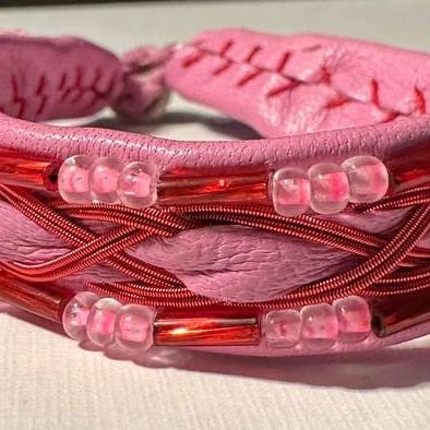 Tenntråds armband i rosa skinn , rennhorns knapp