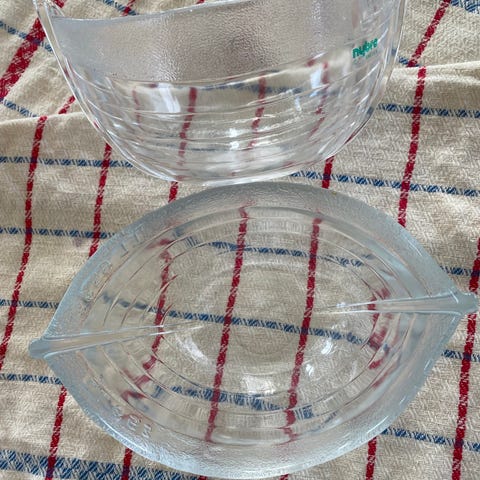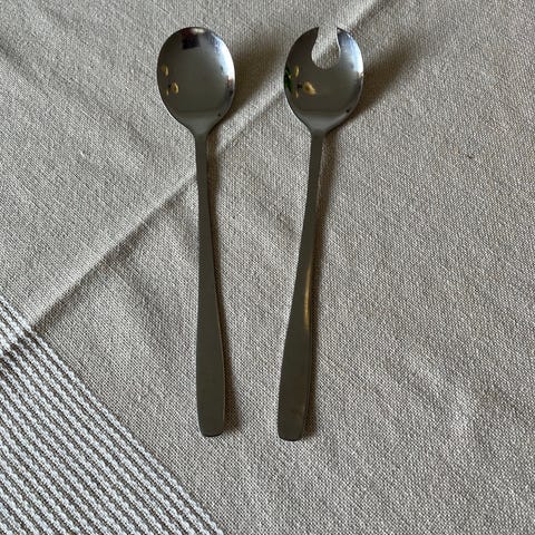 Häftigt retro salladsbestick med bladet i transparent plast och skaft i vitt som liknar pärlemor. L 23 cm.