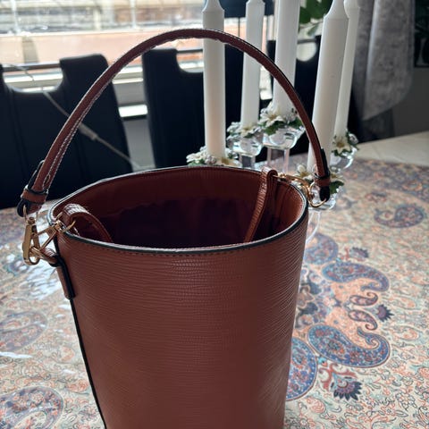 Elegant handväska från Tammy & Benjamin i en vacker brun färg med ett distinkt krokodilmönster. Väskan har ett unikt handtag och kommer med en matchande mindre väska och ett bälte. Perfekt för att lägga till en touch av sofistikering till din outfit. Bara använts några gånger, det verkar helt nytt.