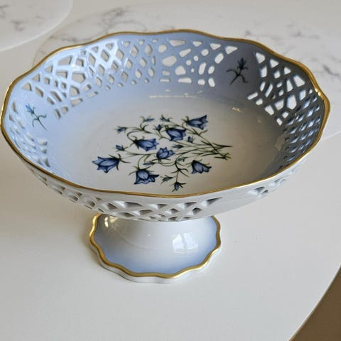 Vackra dekorativa tallrikar i porslin med genombrutet bräm, guldkant och blommotiv i Flora Danica-stil.