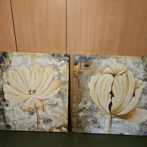 Tavlor enligt bilder med motiv av blommor. När den är uppsatt är den ca 145 cm bred Det största tavlan är 90 cm hög. Upphängning sitter fast baktill, det är bara att slå i spik i väggen.
