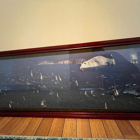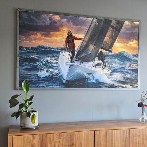 Canvastavla över medelhavskust med historiska och mytologiska inslag. Staty av Poseidon.