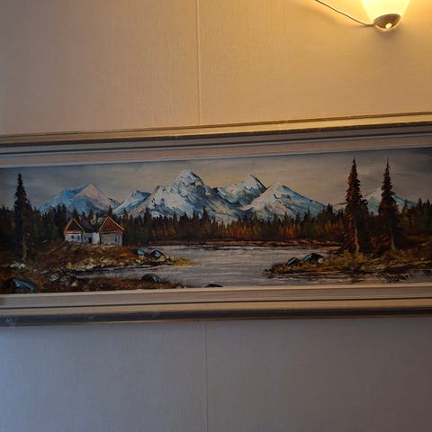 Retro vinterbonad från 50/60-talet med björn, rådjur, snötyngda granar och fjällmotiv. I förgrunden en krukväxt som ger extra charm. Bonaden är signerad (svårläst) och sitter i bred guldram.