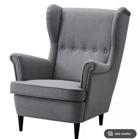 Strandmon fåtölj, helst grå el ljusgrön/mintgrön.