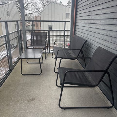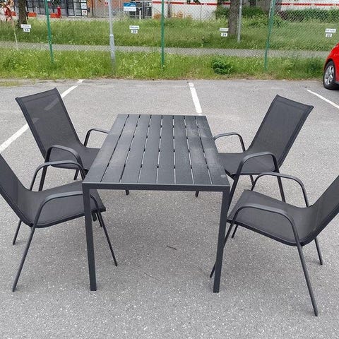 Loungeset Inkl. dynor kanske till en mindre balkong. Vilstol 59×70×67 cm, soffa 114×70×67 cm, bord 65×42×35 cm, Tyget på dynorna är avtagbart och kan behöva tvättas om man vill annars en stabil möbel utav metall och konstträ. Transport kan ordnas mot en avgift på 500 kr inom Örebro.