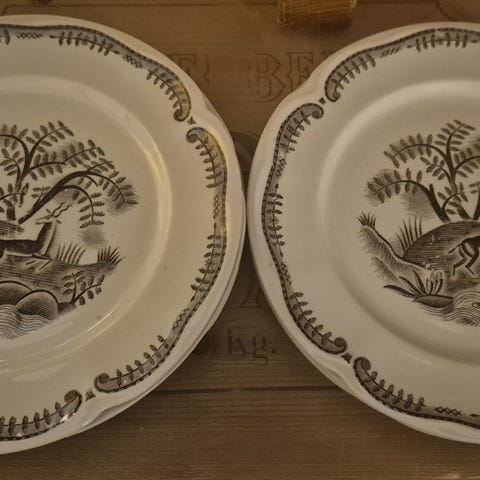 Denna bilder visar två tallrik från Höganäs Keramiks "Gille"-serie, med motiv hämtat från en bonadsmålning utförd av Johannes Nilsson i Halland år 1814.