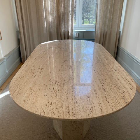 Cirka 75 cm högt, med skiva om 97 x 150 cm. Funkar lika bra inne eller ute. Foten går att kapa om man tycker att bordet är för högt.