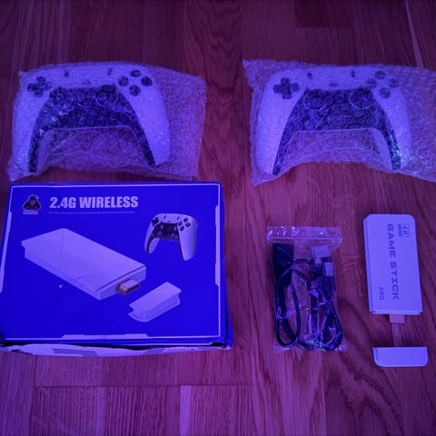 Spelkonsol med 2.4G trådlösa handkontroller. Ansluts till TV via HDMI. Superenkel att starta. Finns Massor av olika spel! Super Mario i massor av olika varianter, donkey Kong och andra olika gamla favoriter. Kontrollerna har 2 aaa batteri ivar. Man kopplar in game stick i teven. Startar dosan. Sen är det bara att köra