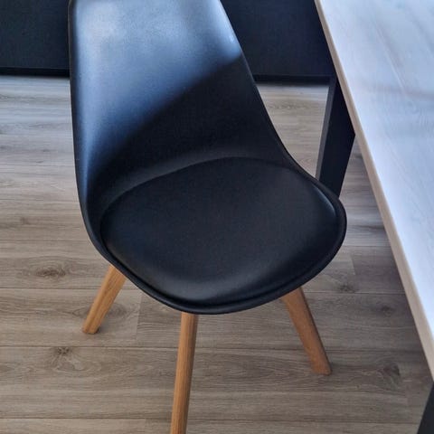 Fina Matstolar i svart plast med trä ben samt stålstänger mellan benen. Samtliga är i mycket bra skick. Priset avser alla 6.