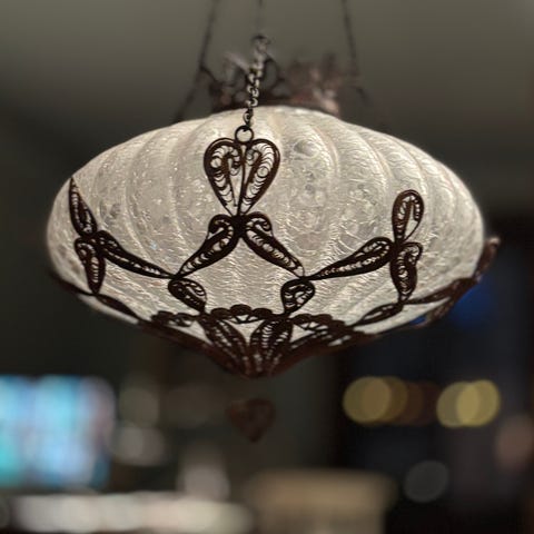 Orientalisk lampa, silver metall, glas sidor, längd 37 cm, diameter 16 cm, lång metall kedja.