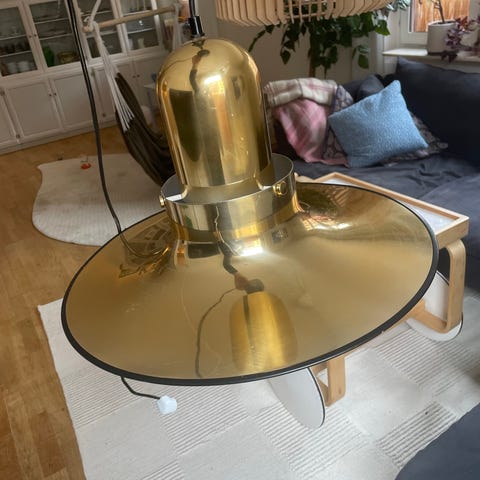 Taklampa metall med diskret guldfärgad kant nedtill troligtvis väldigt ovanlig eftersom jag i alla fall inte kan hitta den någonstans men det kanske du lyckas med? Gallret undertill är också guldfärgat men också det diskret. Bild 1 ger ett märkligt intryck men trots flera försök så blir det inte bättre. Höjden är 26 cm och omkretsen 40 cm.