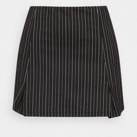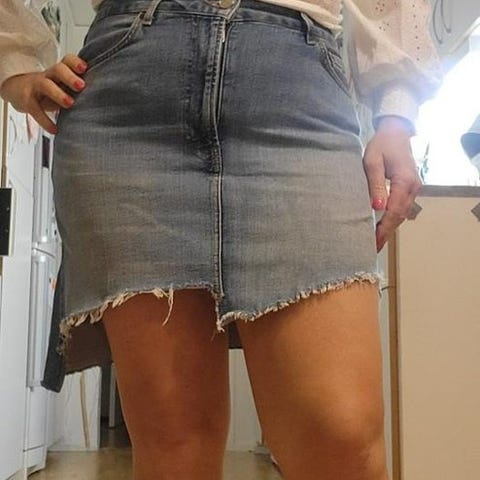 Minikjol med dragsko i midjan med resår, fickor på sidorna. Tyget är bumull som sweatshirts tyg. Små slitsar i sidorna som ger fin design. Oanvänd, ganska stor i storleken passar S också.